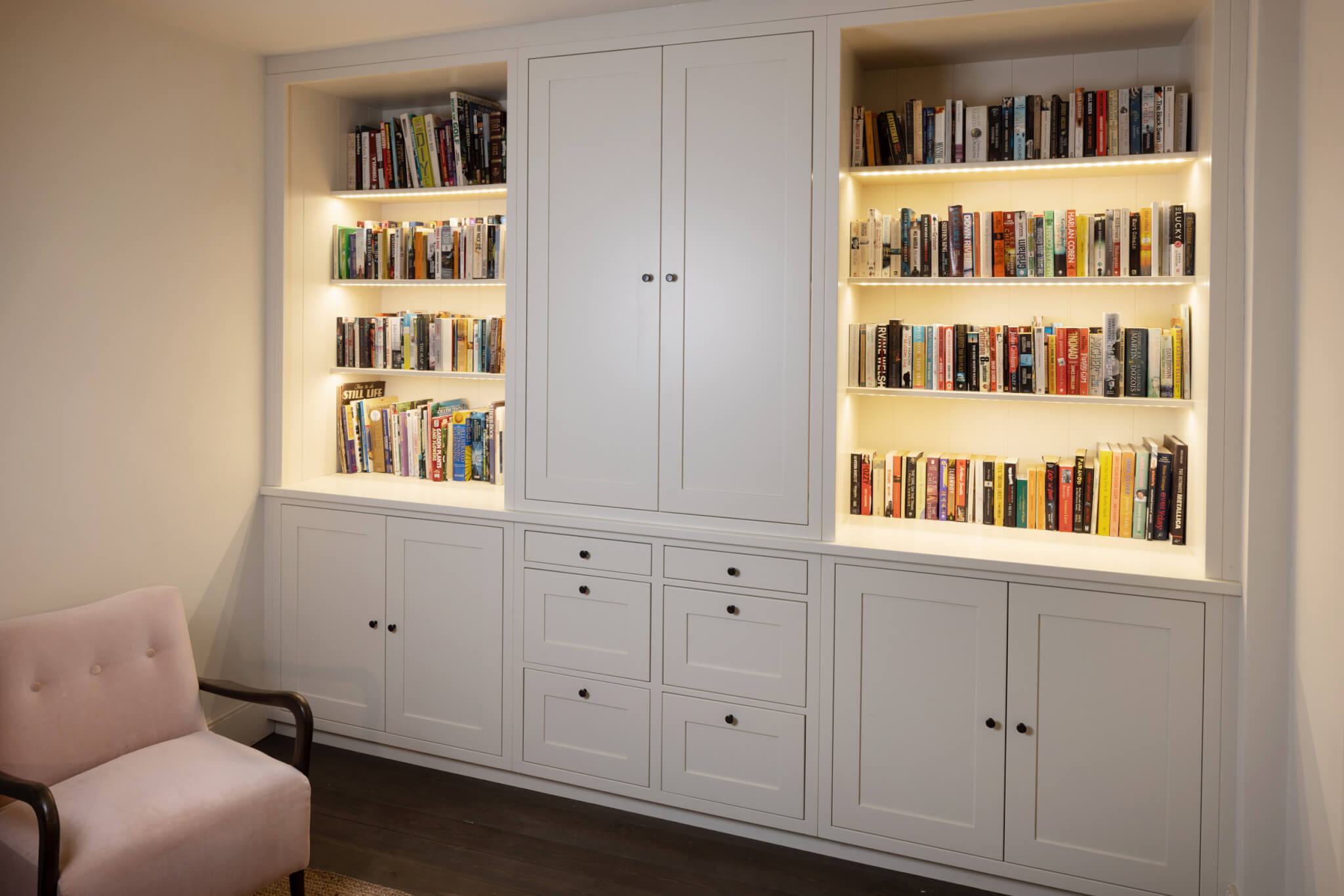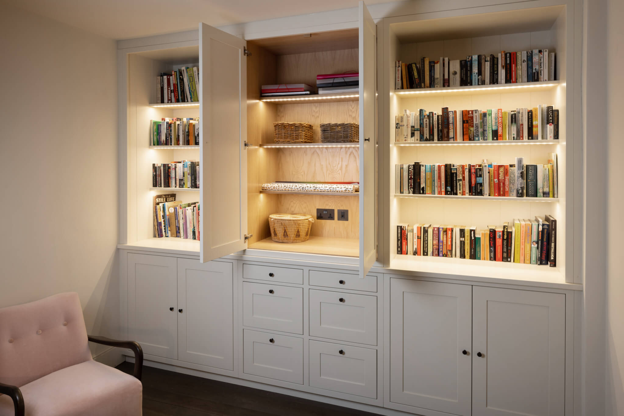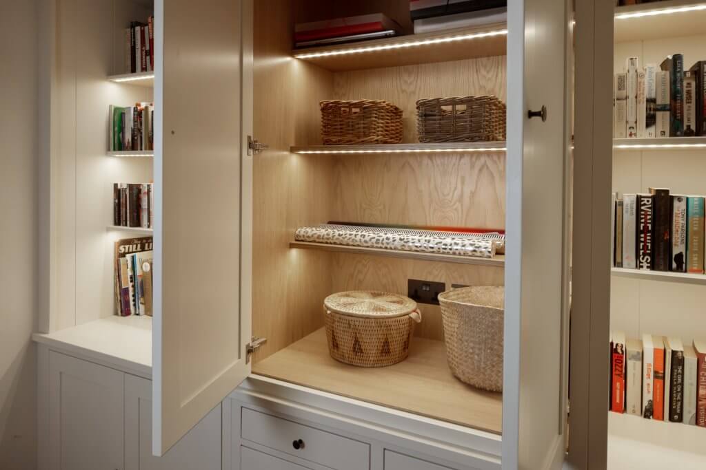 Designed to help our client make the most of their Suffolk home office, this bookcase features shaker style doors, factory finished spray painting, oak interiors and the perfect combination of open and closed storage space.