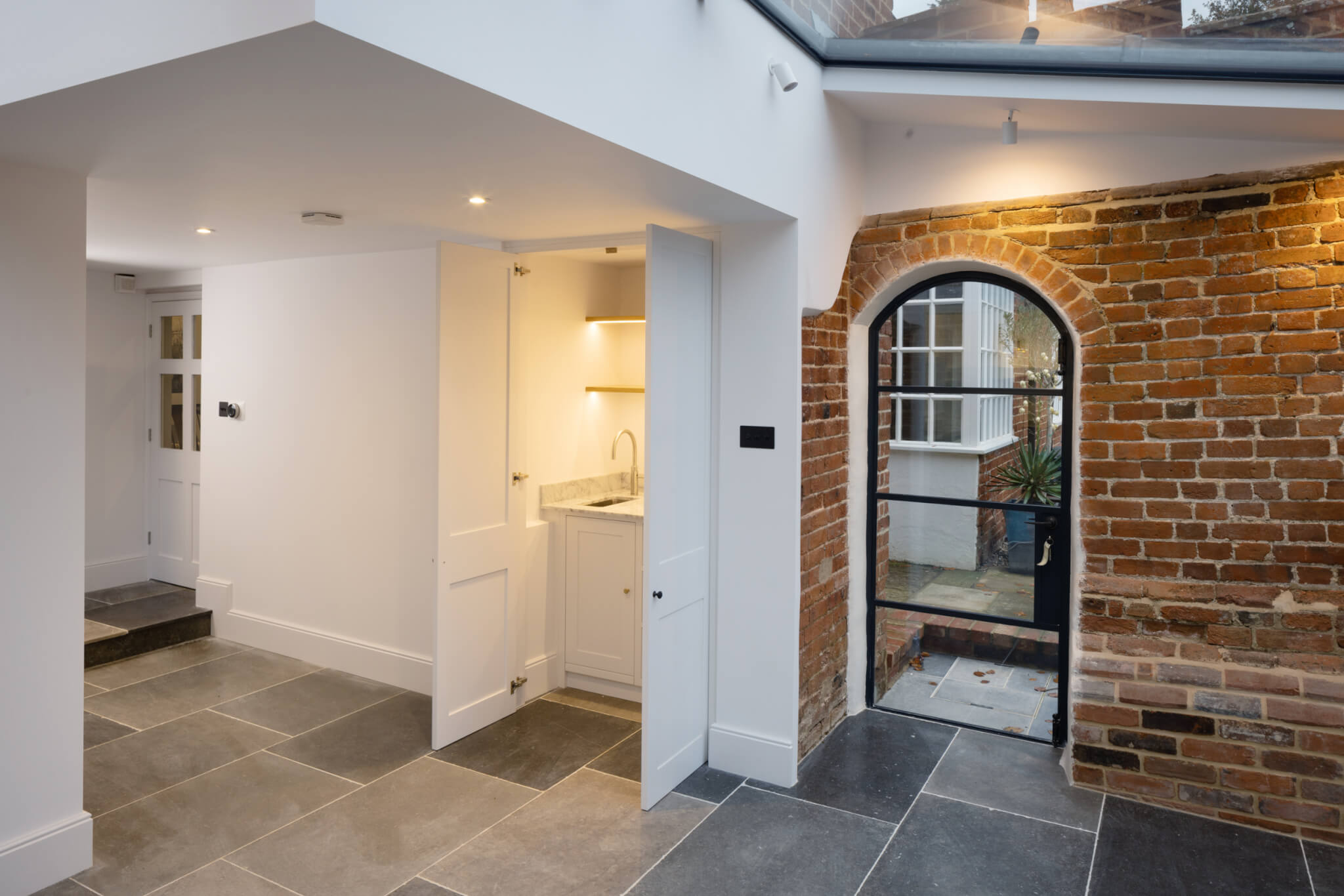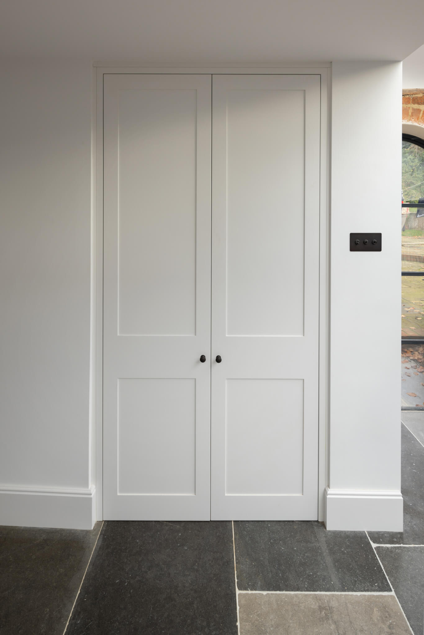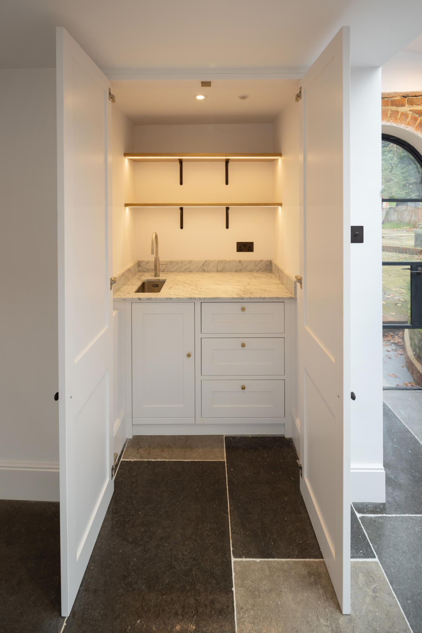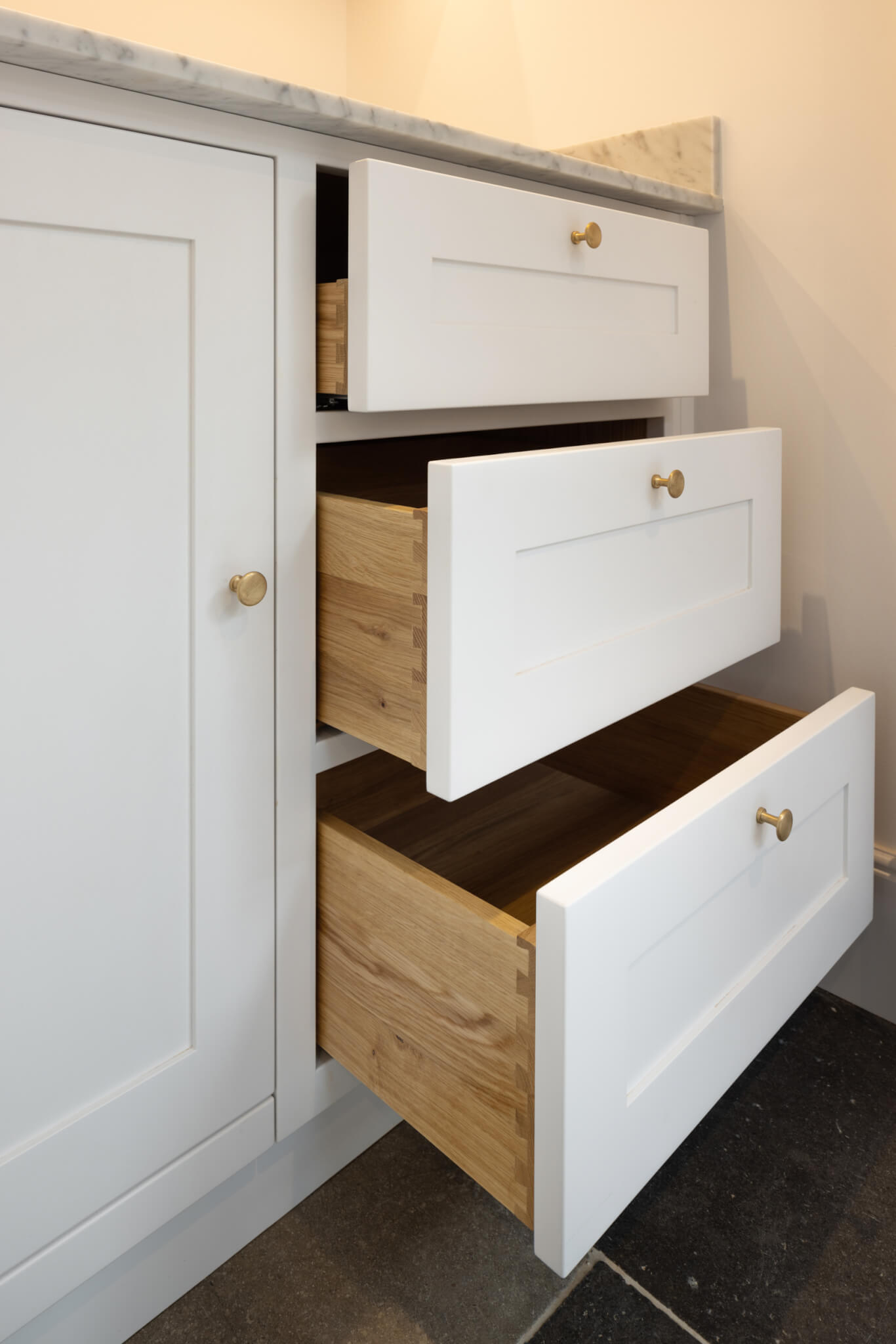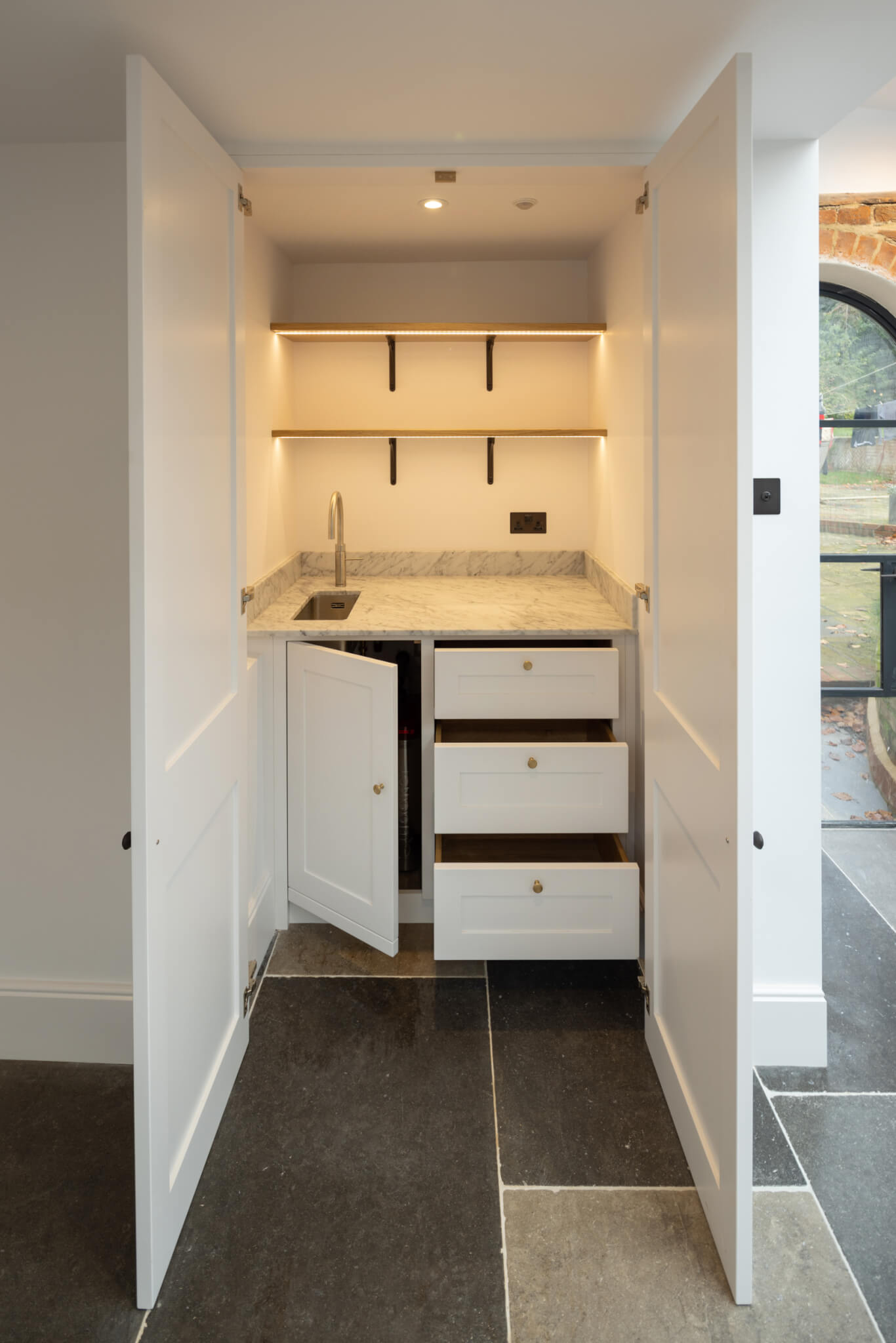 Our clients wanted a discreet breakfast bar designed for their home. Hidden away behind a pair of shaker style doors lies a bespoke breakfast bar featuring oak dovetailed drawers and a spray-painted finish.