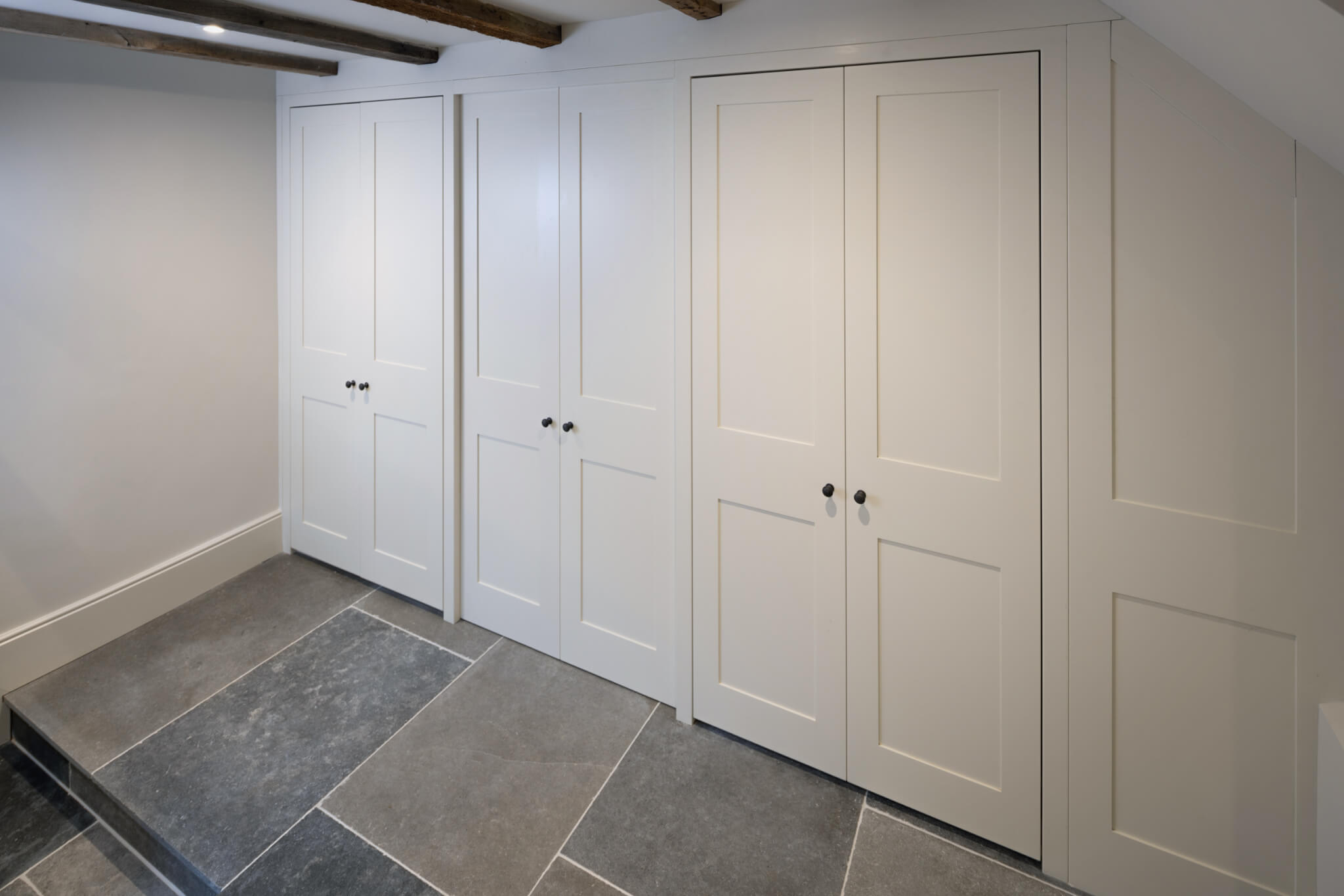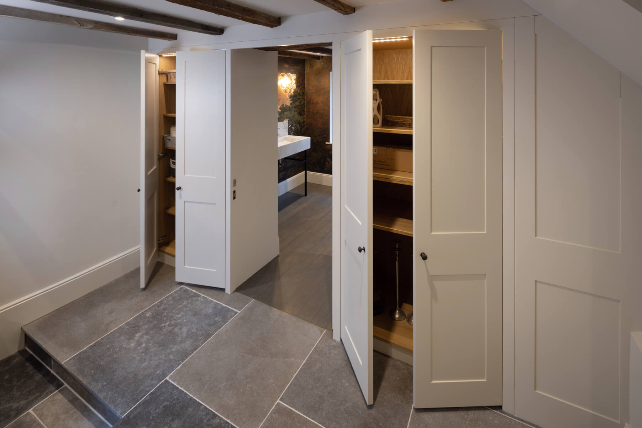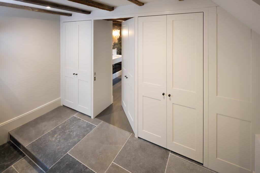 This project in Woodbridge, Suffolk involved us designing a bespoke solution for storage within a hallway leading to the cloakroom. Featuring built in storage either side of a secret door, with oak interiors to the storage units and a spray-painted finish to the doors.
